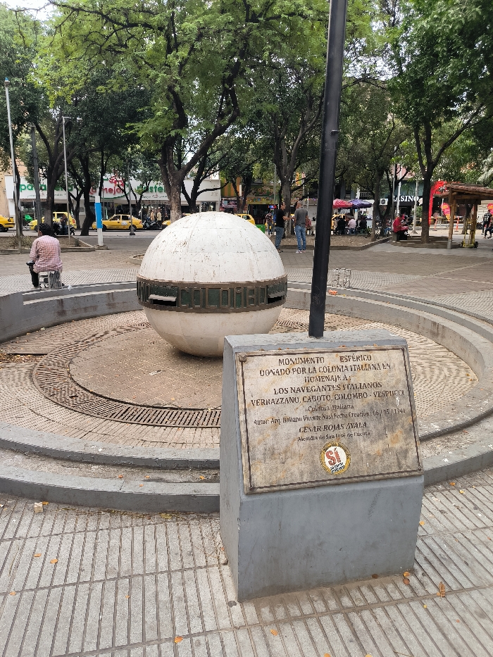 This image captures a public square or park area within Perímetro Urbano Cúcuta, Colombia. In the foreground, a spherical monument, approximately 1.5 meters in diameter, is positioned within a circular, stepped concrete base. The sphere is off-white and features a central bronze-colored band with embossed lettering, partially visible as "COLOMBIA". The base includes a circular metal grate. Immediately to the right of the sphere, a rectangular concrete pedestal supports a weathered bronze plaque. The plaque's inscription reads: "MONUMENTO ESFÉRICO DONADO POR LA COLONIA ITALIANA EN HOMENAJE A: LOS NAVEGANTES ITALIANOS VERRAZZANO, CABOTO, COLOMBO - VESPUCCI Colonia Italiana Autor: Arq. Italiano Vicente Nasi Fecha Creación: 05 / 1940 CESAR ROJAS AYALA Alcaldía de San José de Cúcuta." A red and white circular logo with "SI" is affixed to the bottom of the plaque. A black pole extends vertically upwards from behind the pedestal. The ground is paved with light grey interlocking concrete tiles, with some scattered dry leaves. To the left, a person wearing a red and white plaid shirt sits on a low concrete barrier, facing away from the camera. In the mid-ground, numerous mature trees with dense green foliage provide shade across the area. Several individuals are visible in the background: two men stand conversing to the right of the sphere, while further back, a group of people are seated at tables under umbrellas near commercial establishments. Yellow taxis are parked and moving on a street beyond the monument area. Buildings line the street, featuring various storefronts, including one with "CASINO" and another with "PARADISE" signs visible. A small wooden structure with a pitched brown roof and electric scooters are present on the right side of the frame.