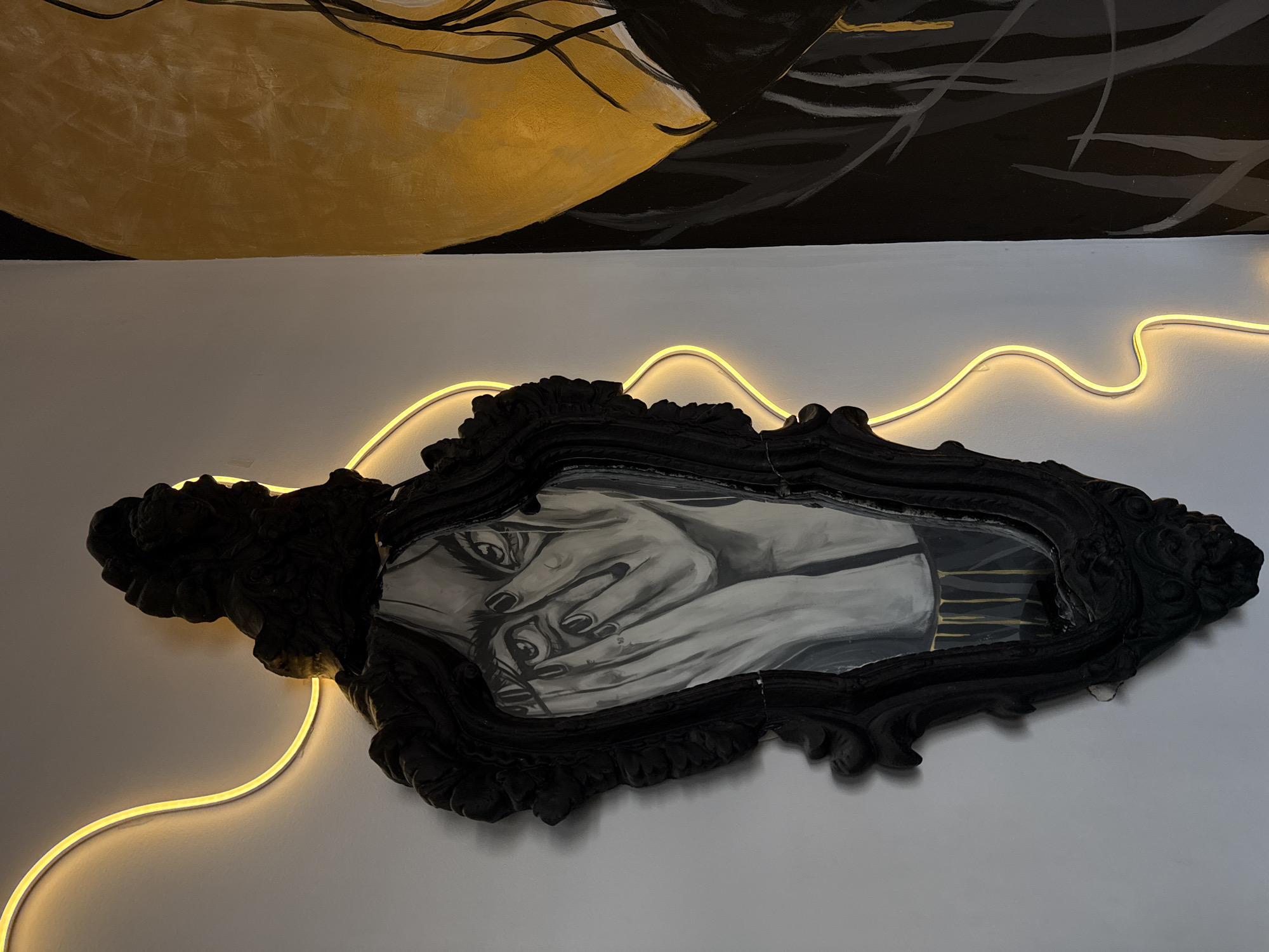 An eye-level shot depicts a portion of a white wall adorned with artwork. An ornate, black-framed picture, seemingly a monochrome painting or drawing, is mounted on the wall. The art within the frame appears to depict hands obscuring a face or eyes. A yellow, neon-style light fixture traces the contours of the picture frame, adding an illuminated outline. Above the white wall, a segment of a painted ceiling is visible, featuring abstract forms in hues of gold and black. The image was taken indoors. The location is in the city of Krasnoyarsk, Russia.
