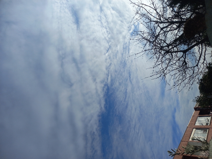 An outdoor scene in Burcht, Belgium, is depicted under a partly cloudy sky. The upper two-thirds of the image display a blue sky interspersed with white, scattered altocumulus cloud formations. In the lower-left quadrant, a red-brick building is partially visible, featuring multiple rectangular windows with white frames, which reflect portions of the sky. A light-colored, slender-leaved shrub is positioned in the foreground of the building, with a white railing visible below it. The lower-right quadrant is dominated by a large, deciduous tree with dark, bare, intricate branches silhouetted against the bright sky. A denser, darker shrub or tree is situated behind and to the right of the prominent bare tree. A dark fence or wall forms the bottom edge of the image on the right side. No individuals are present in the depicted scene.