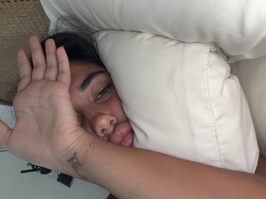 The scene depicts an individual lying on a bed in Kerobokan Kelod, Indonesia. The person, with medium skin tone and dark hair, is positioned with their head on a white pillow, facing slightly towards the camera. Their left arm is raised, with the hand covering the forehead and eyes, obscuring the upper facial features. The left eye is partially open, and the mouth is slightly open, revealing full lips. A faded tattoo resembling a stylized star or animal is visible on the inner aspect of the left wrist, with faint reddish marks or scars present on the forearm below the tattoo. Indistinct dark objects are visible in the background to the left, while a light brown, woven texture, consistent with a headboard, is visible in the upper right background. The lighting is soft and ambient.