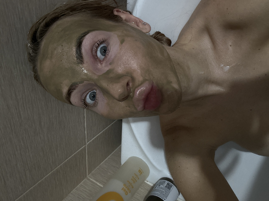 The image displays a female subject in a bathroom within a white bathtub, located in Novoe Devyatkino, Russia