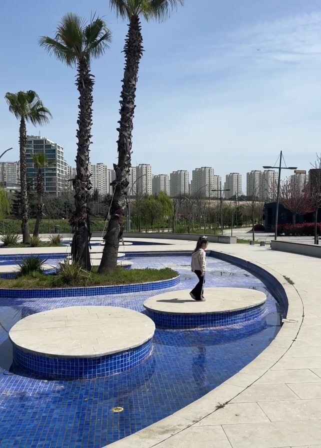 A young child is outdoors in a park-like setting. The park has a modern design, with a shallow pool tiled in blue, featuring several round, concrete platforms. Three palm trees stand near the edge of the pool. In the background, a row of tall, modern apartment buildings stretches across the horizon under a blue sky with light clouds. The child, wearing a light-colored jacket and dark pants, stands on one of the round platforms and jumps to the concrete walkway. They then proceed to walk along the walkway, away from the camera. The area appears to be well-maintained with trimmed hedges and some trees that are starting to bloom.