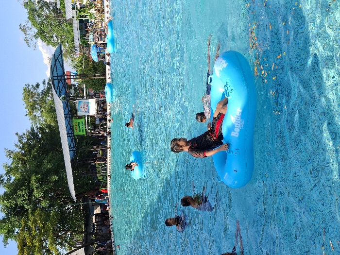swimming pool in a water park located at coordinates -7.592 latitude, 110.649 longitude in Kecamatan Tulung, Indonesia. There are people swimming and floating on blue inflatable tubes in the pool. A young man is sitting on a blue tube with the word "Boulder" written on it. The man is wearing a black T-shirt and red shorts. Other people are swimming in the water, including a man in a red shirt. The scene is sunny and appears to be during the day. The water is clear and blue, and the pool is surrounded by trees and a white metal roof structure. The scene appears to be a water park with a designated area for swimming and floating.