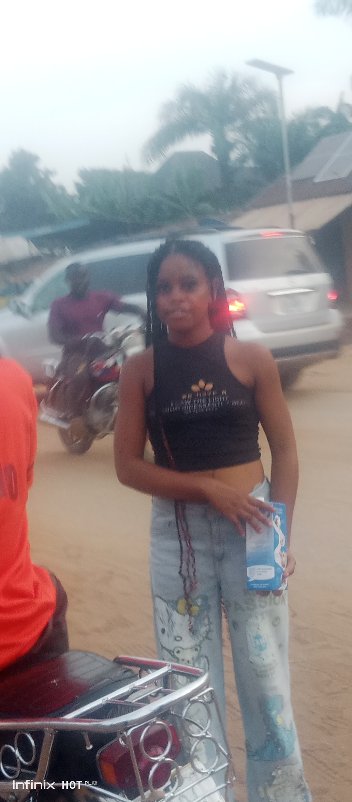 A young woman with braided hair stands outside, wearing a black crop top and light-wash jeans adorned with cartoon character graphics. She holds a small, blue carton in her hand. Behind her, a silver SUV is partially visible, with a person on a motorcycle nearby. The scene appears to be in a residential or semi-rural area, with trees and a solar-powered street light in the background. The image has a slightly hazy quality, suggesting it might be dusk or dawn.