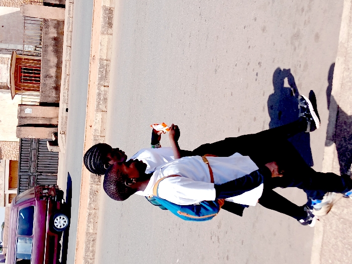 The image displays two individuals, likely children or young adults, walking on a paved surface adjacent to a road in Plumtree, Zimbabwe, under bright daylight. The person in the foreground, a male, wears a white short-sleeved shirt over a dark long-sleeved garment, black trousers, a tan belt, a blue backpack, and athletic shoes (blue and white on the visible foot). The person behind him, a female, has braided hair and wears a white short-sleeved shirt, black trousers, and black and white athletic shoes. She holds a small, white and orange packaged item in her right hand. Both individuals are walking from left to right across the frame, appearing to move parallel to the road. In the background, a dark maroon van is partially visible on the road to the left, while across the road, residential or commercial buildings with concrete walls and a dark metal gate are present. A concrete curb separates the walking area from the asphalt road. Distinct shadows are cast by the individuals on the ground, indicating direct sunlight.