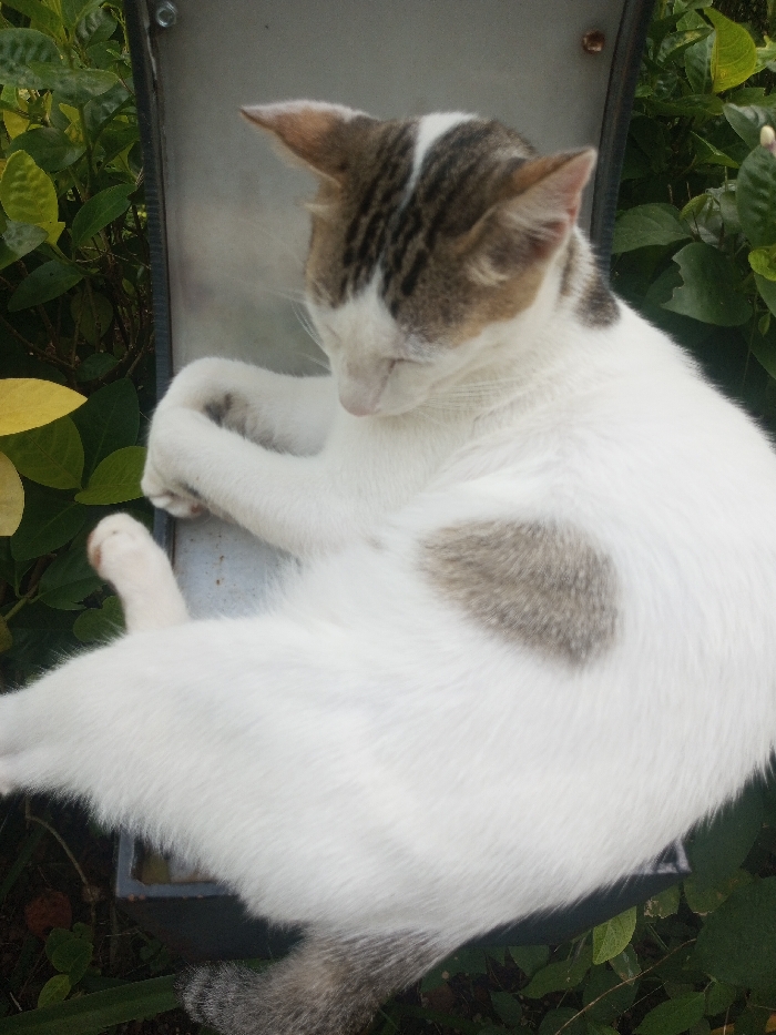 - "A cat, mostly white with gray tabby markings on its head and tail, curls up in a metal container, possibly a planter" by FM-KfPFQ2, licensed under CC BY 4.0