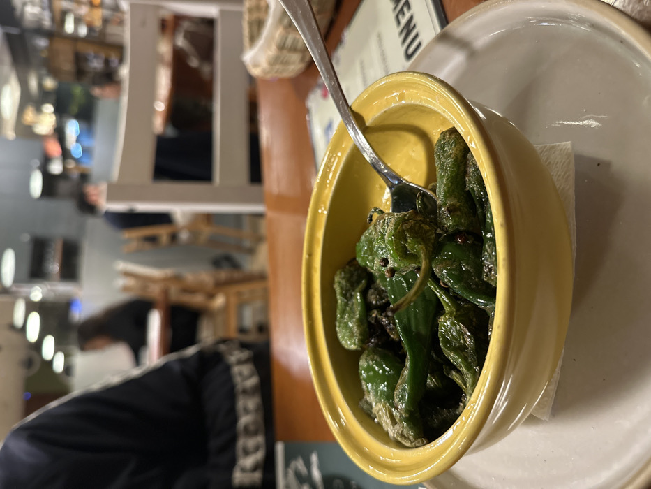 A yellow bowl filled with sautéed green peppers sits on a white plate. A silver fork rests in the bowl amongst the peppers. The bowl and plate are on a table. In the background are chairs and people in a dimly lit restaurant. Part of a menu can be seen behind the bowl. A person wearing a black jacket with white stripes is seated at the table.