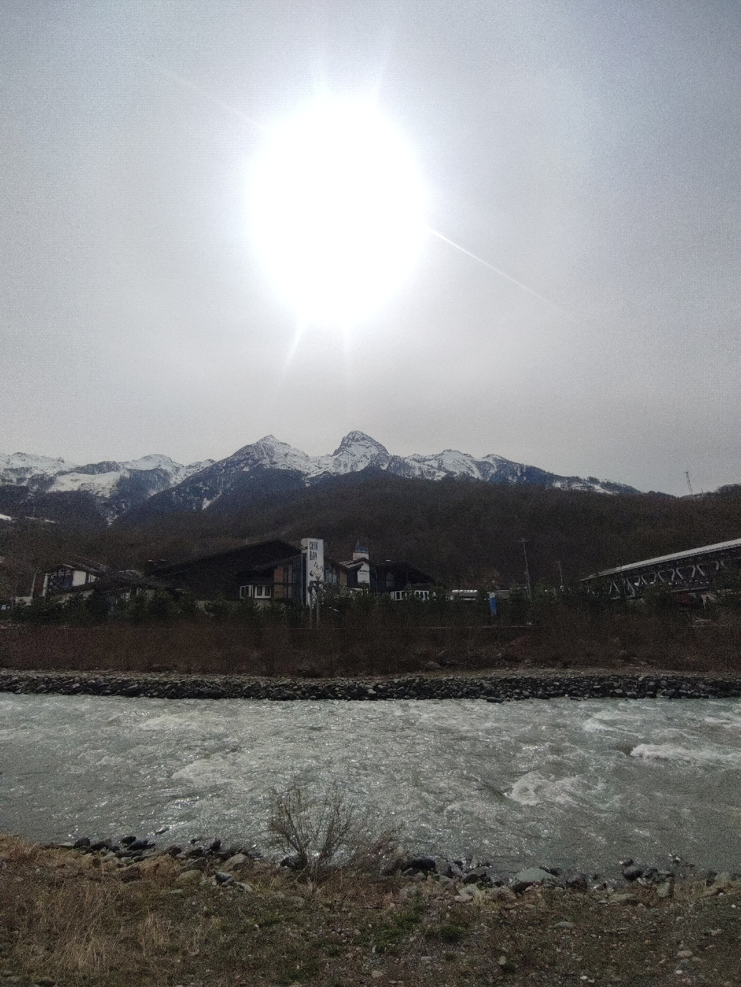 The image presents a landscape in Estosadok, Russia, dominated by a rapid river in the foreground. The river is turbulent, with visible ripples and white water. The riverbank is lined with rocks and sparse, dormant vegetation. Behind the river is a thin strip of brush and low trees. Beyond the trees are buildings and a bridge. The buildings appear to be part of a resort complex, based on the architectural style. Behind the resort is a dense forest that rises to meet a range of snow-capped mountains in the background. The sky is overcast, with a bright sun that appears to be high above the mountains. The overall scene suggests a cold or cool climate due to the snow and dormant vegetation.