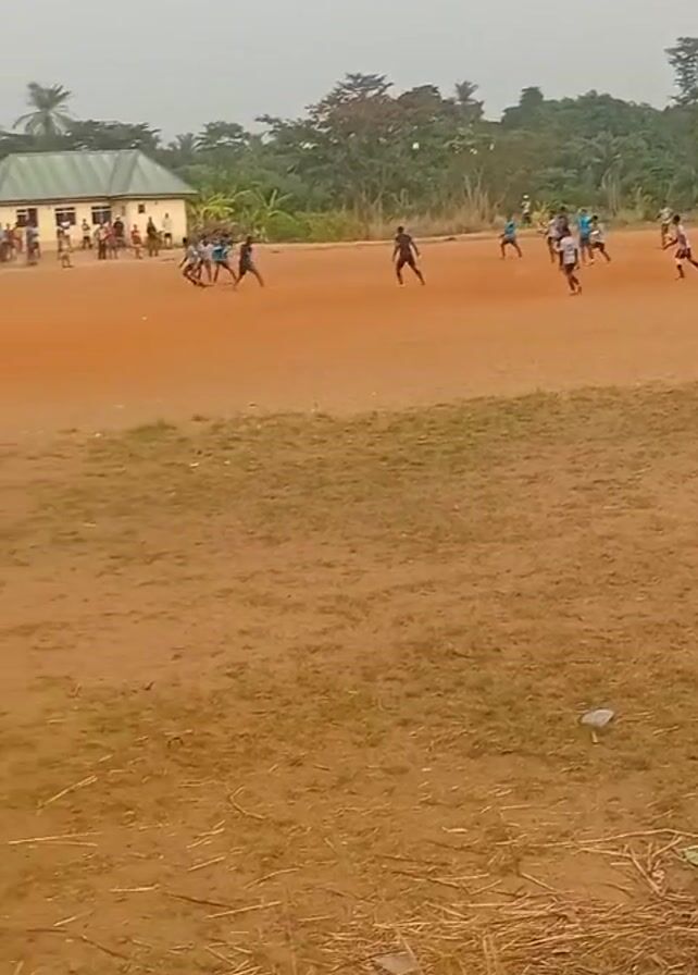 soccer game in progress on a dirt field. Several players in athletic attire are scattered across the field, kicking and chasing a ball. On one side of the field, a small crowd of spectators is gathered near a single-story building with a corrugated metal roof. The surrounding environment includes trees and other vegetation, typical of a rural or semi-rural area. The weather appears overcast. The foreground of the video consists of dry, patchy grass and bare dirt.