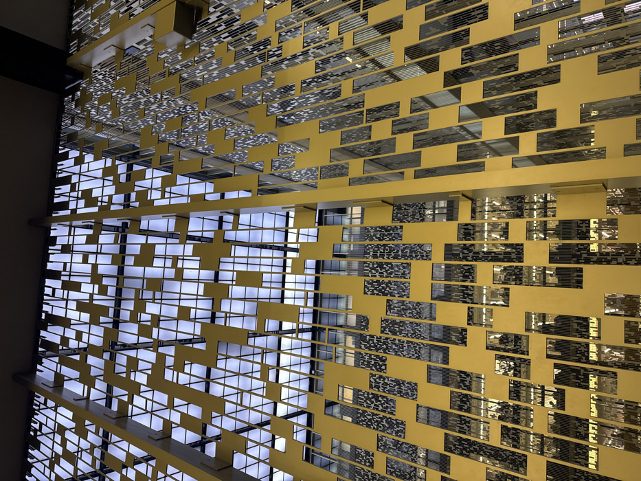 layered, geometric structure with a gold-toned framework. Rectangular and square openings are arranged in a grid pattern, revealing a brighter, possibly illuminated, interior space. Some sections feature inset, reflective or patterned rectangular tiles. The perspective is from below, looking upwards, emphasizing the depth and complexity of the design. The lighting creates highlights and shadows, enhancing the texture and dimension of the piece.