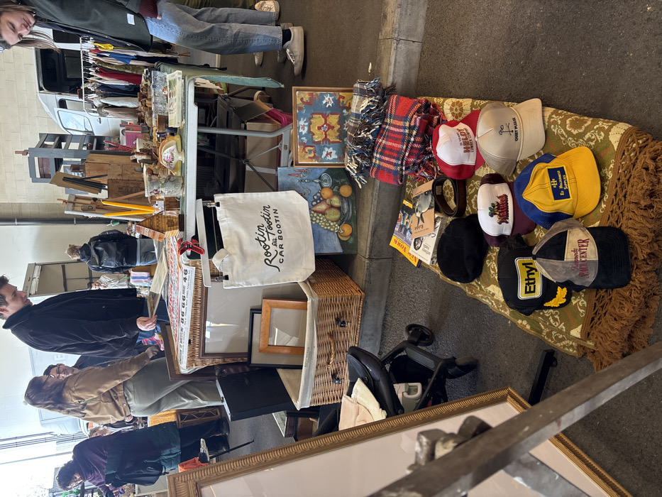 The image depicts an active indoor car boot sale or flea market setting in London, United Kingdom, characterized by a concrete floor and a high ceiling. Multiple individuals are present, browsing various stalls. In the mid-ground, a central stall features a white folding table displaying a variety of vintage and used items. These include several ceramic vases, decorative wooden objects, books, and two yellow tapering candles. A white canvas tote bag, emblazoned with "Rootin' Tootin' Car Bootin'," hangs from the table. Underneath, a large wicker basket contains multiple picture frames, including one orange-brown and one black. On the ground directly below the table, two framed artworks are displayed: one depicting a still life of fruit and a candlestick, and another with colorful abstract patterns. In the immediate foreground on the right, ten assorted baseball and flat caps are arranged on a fringed, ornate blanket laid directly on the concrete. Visible logos on the caps include "Ethyl," "Kennedy Space Center," "Hildy Lumber Co," and "Quiet Please." Adjacent to the caps, a stack of books, prominently featuring one with a yellow "New York" cover, is present alongside a brown leather belt. Two folded plaid blankets are stacked on top of the books. On the left side of the foreground, a large, ornate gold-framed mirror leans vertically, partially obscuring a black baby stroller or cart. Several patrons interact with the scene. In the mid-ground, a woman in a light brown jacket and a man in a dark jacket are observing items on the central table. To their right, a young woman in a dark green jacket and blue jeans stands near the same table, looking down at the merchandise. In the background, additional individuals are visible, including one man wearing a backpack. A white commercial van, with its rear doors open and displaying clothing on racks, is parked further in the background, signifying another vendor's setup.