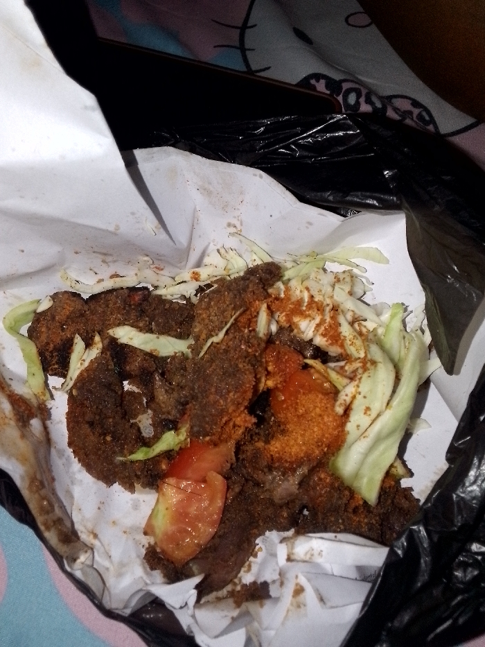 - "Brown fried meat pieces with shredded cabbage and tomato slices are piled in a white paper bag, enclosed within a black plastic bag" by FM-DY5ij1, licensed under CC BY 4.0