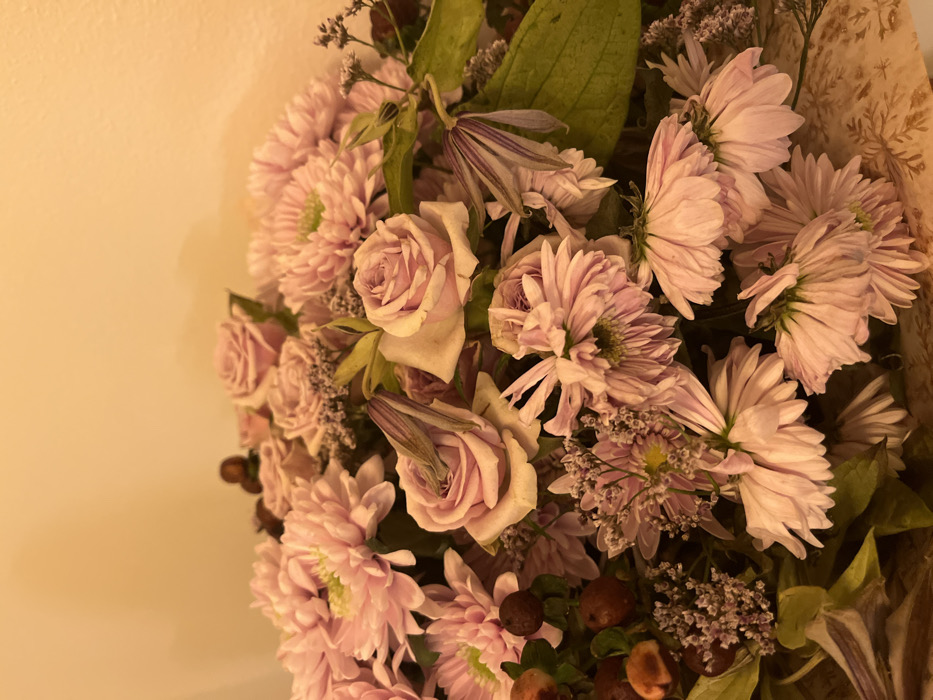A bouquet of light pink flowers, including chrysanthemums and roses, dominates the scene