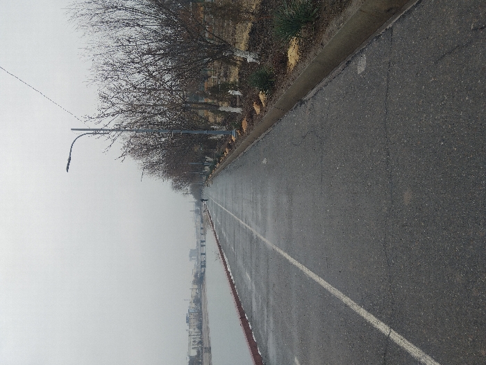 A long, straight road stretches into the distance under a hazy sky. The road has a single white line marking its center. To the right, the asphalt is dark gray, bordered by a concrete curb and sparse vegetation. To the left, a red stripe lines the edge, followed by a misty, undefined area. Bare trees stand along the roadside, with lamp posts extending above them. Buildings are faintly visible in the far distance.