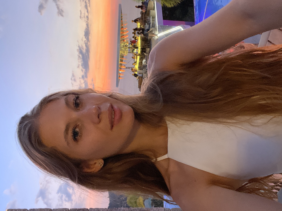 An outdoor, eye-level selfie-style image captures a young female subject, positioned centrally, looking directly at the camera. She has long, light brown hair, blue eyes, and wears a white halter-neck top with small golden circular earrings. The background reveals an elevated, open-air bar or restaurant overlooking the ocean at sunset or twilight in Karon, Thailand. The sky transitions from orange and pink at the horizon to light blue at the top. Numerous individuals are gathered around a circular bar structure, which is illuminated and features reddish-orange decorations suspended from its canopy. A portion of a blue swimming pool is visible on the lower right, with tropical foliage beyond. A stone structure is partially visible on the far left.