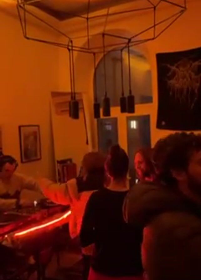 small party. A DJ plays music at a table with a red LED strip. Several people are gathered around talking. The room is dimly lit with orange light. There is a decorative light fixture hanging from the ceiling, and a large black cloth on the wall. A large mirror is leaning against the wall.