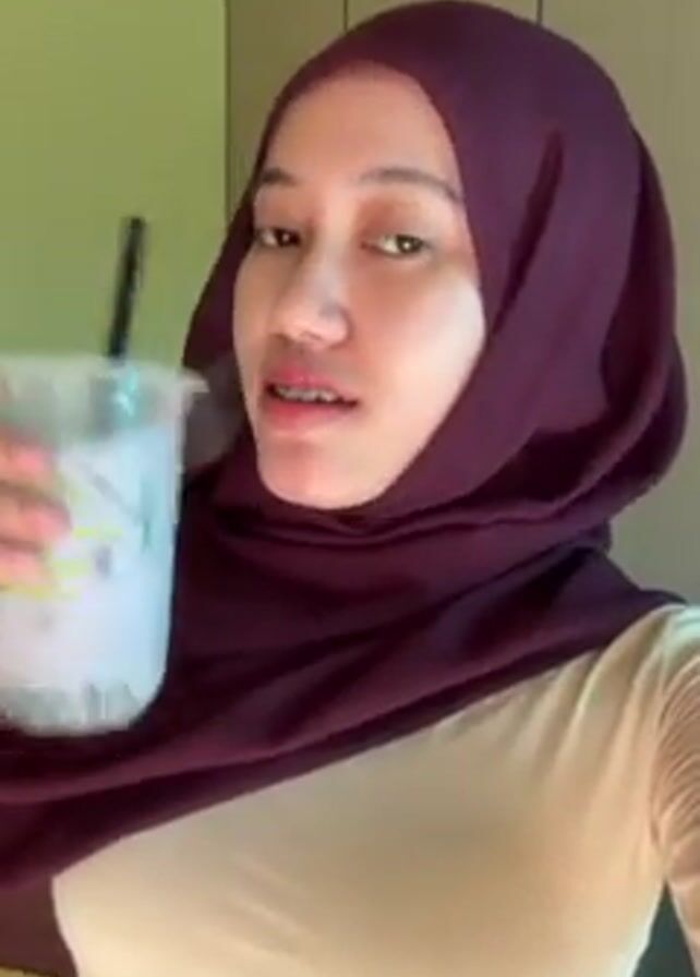 A young woman is holding a plastic cup filled with a white liquid, likely a drink, and a straw. She is wearing a maroon hijab and a cream-colored shirt. She smiles, revealing braces, and briefly winks at the camera. The background is a muted beige color.