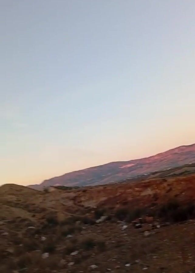slightly hazy landscape under a blue-to-peach gradient sky at what appears to be either sunrise or sunset. In the foreground, there's barren terrain with sparse vegetation, possibly desert or scrubland. The camera moves slightly, revealing a solitary figure standing on the crest of a small hill. Beyond the foreground, there's a range of hills or mountains, their upper edges tinted with pinkish light. The camera's motion indicates it's likely handheld. The overall scene suggests a rural or desolate environment.