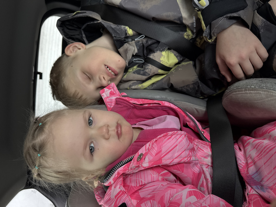 Two children are observed seated in the rear passenger compartment of a vehicle, in the city of Кондратово, Russia