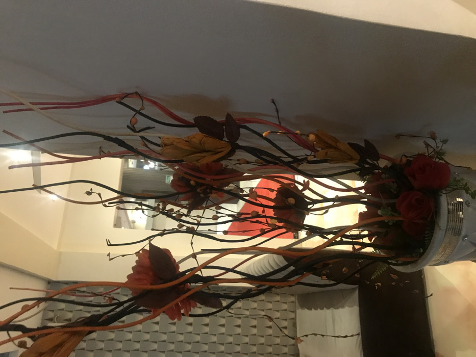 The scene is located indoors in Lekki, Nigeria. The image depicts a large, artificial decorative floral arrangement positioned in a white vase, which features silver-toned banding and white embellishments near its base. Numerous thin, stylized branches, predominantly in black, orange, and red, extend vertically from the vase. Attached to these branches are artificial flowers and foliage in shades of orange, dark red, and yellow-brown. Clusters of small, orange, berry-like objects are also present on some branches. At the base of the arrangement within the vase are several smaller, artificial red roses and green filler foliage. In the background to the left, a section of a textured wall or paneling with a geometric, possibly three-dimensional, pattern is visible, appearing in a light grey or beige tone. Partially visible beneath this paneling is a portion of a light-colored sofa or seating unit, showing its armrest and cushions. The central background reveals a reflection in a mirror or through an opening into an adjacent area. This reflection shows overhead lighting fixtures and a prominent red-colored object, possibly a piece of furniture like a sofa or chair. The right side of the image features a plain, light-colored wall, likely off-white or light grey. The environment is illuminated by ambient indoor lighting. No people, specific actions, or interactions are visible.