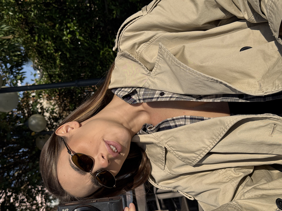 A female subject is captured in a medium close-up, outdoors, under direct sunlight, within an environment consistent with a park or pedestrian area in Sirmione, Italy. Her head is tilted slightly to her right, and she looks directly at the camera, wearing dark oval sunglasses with thin metallic frames. She possesses long brown hair with lighter highlights, cascading over her shoulders. Her mouth is slightly ajar, revealing upper teeth. Her left hand is partially visible, holding a black compact digital camera, specifically identified by the "G7X" marking on its body. The subject is dressed in an open beige trench coat, layered over an unbuttoned blue and white plaid shirt. This ensemble reveals a dark garment underneath and a portion of her upper chest and décolletage. The background features dense green foliage, two spherical white public streetlights attached to dark poles, and areas of clear blue sky. No specific landmarks identifying Sirmione are discernible within the visual evidence.