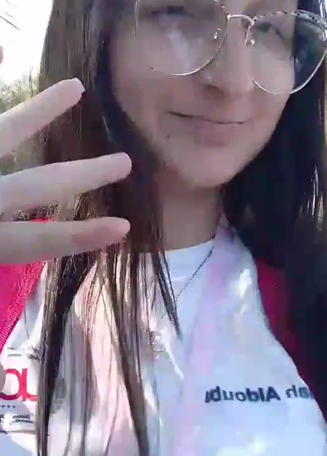 A young woman with dark hair and glasses is standing outside