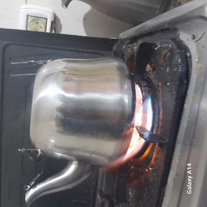 n indoor scene in Khan Yunis, Palestinian Territory. A silver-colored metallic teapot with a prominent spout is centrally placed on a gas stove burner. A blue and orange flame is actively emanating from the burner, heating the underside of the teapot. The gas stove features black grates supporting the teapot, and the stovetop surface below the burner exhibits some dark residue and minor debris. In the upper right background, a white electrical outlet with two circular sockets is affixed to a light-colored wall. A portion of another metallic vessel, possibly a coffee pot or kettle, is partially visible on the far right. No individuals are present. A "Galaxy A14" watermark is visible in the lower-left corner of the image.