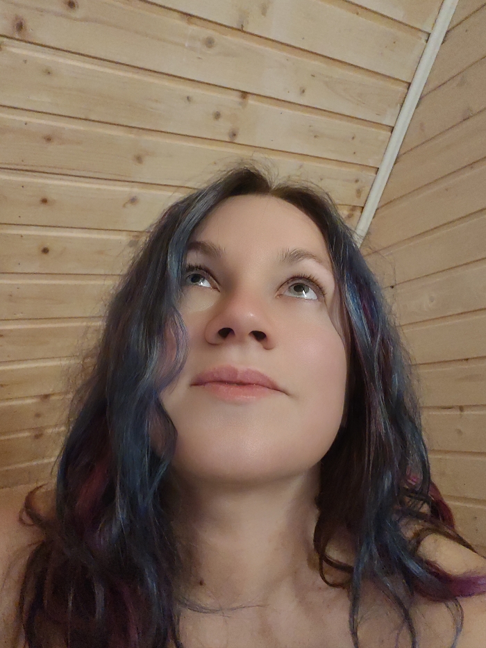 The image depicts a female individual in the city of Свистуха (кузяевский С/о), Russia. The subject is shown from a low-angle perspective, from the upper chest upwards, occupying the lower two-thirds of the frame. She has fair skin, a rounded jawline, and full lips with a light pink tint. Her eyes are light in color, appearing grey or light blue, and are directed upwards. Her eyebrows are light brown. Her hair is long, wavy, and multicolored, predominantly dark blue and purple, with some streaks of reddish-pink visible, particularly on the right side of the frame. Her shoulders are bare, suggesting an off-shoulder garment or partial nudity. The background consists of light brown wooden paneling arranged horizontally, with a faint diagonal support beam visible in the upper right quadrant. The lighting appears even, without harsh shadows.