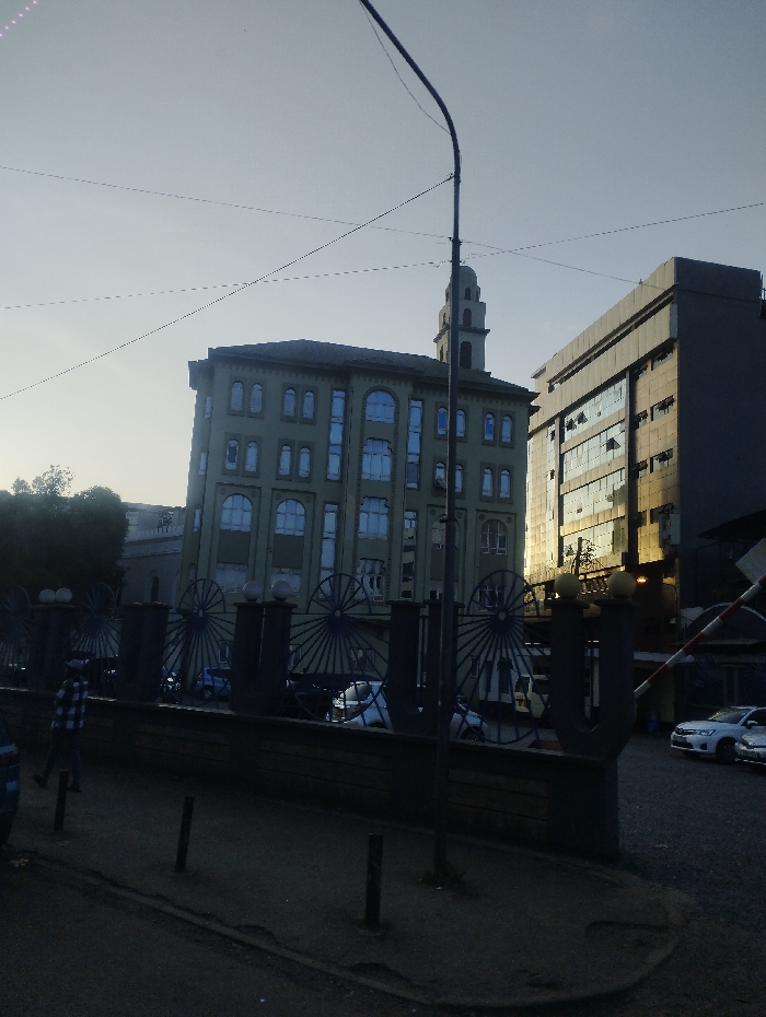 - "A view of two buildings, one with a distinctive tower and arched windows, the other a more modern, boxy structure, against a pale sky" by FM-DV2JF3, licensed under CC BY 4.0