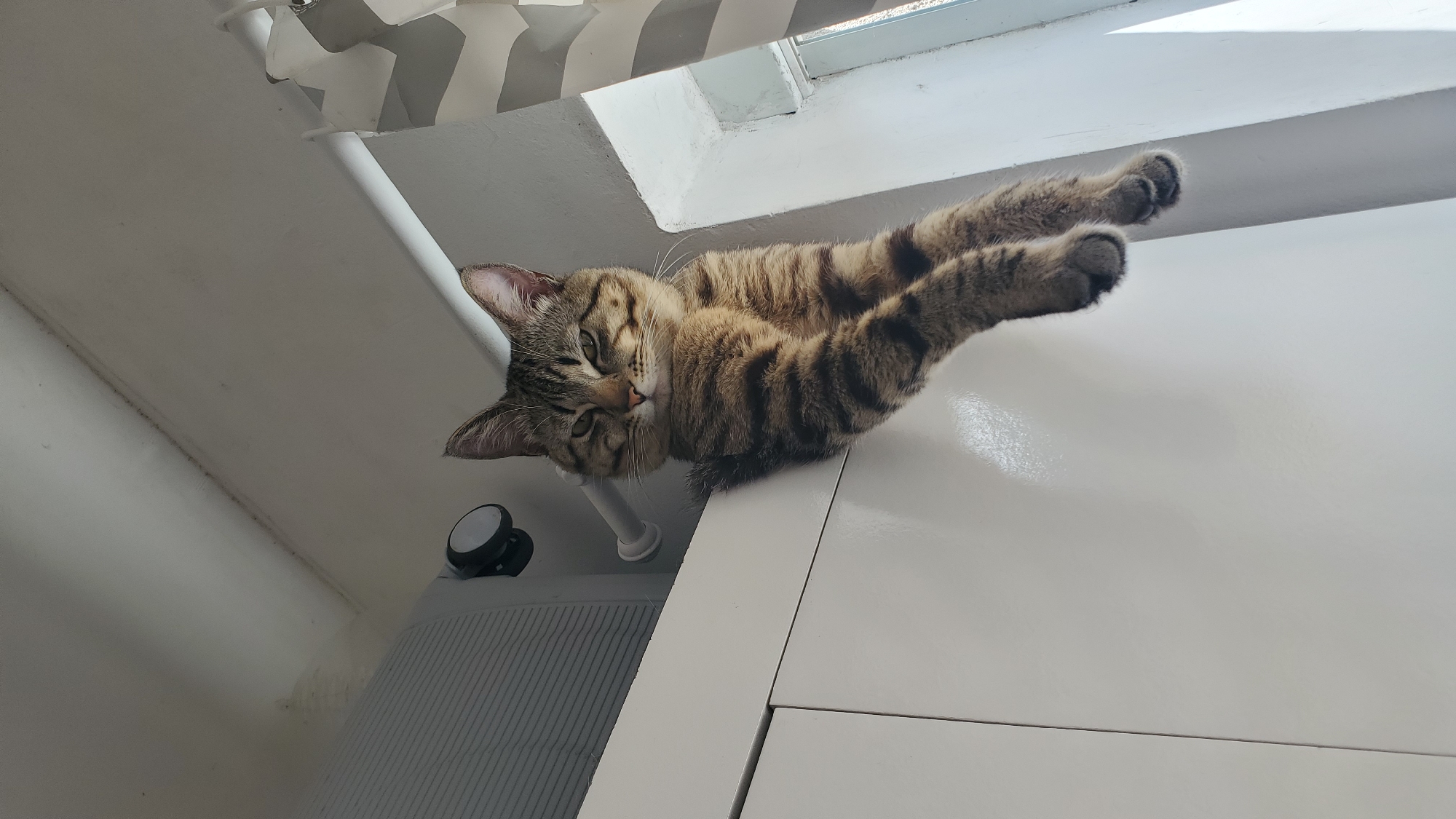 A domestic short-haired tabby cat, exhibiting brown and black striped fur, is situated on a white, glossy surface, identified as a cabinet or shelf, within an indoor environment. The cat's anterior body rests on the surface, while its posterior legs are suspended vertically downwards, with visible paws. Its head is oriented directly forward, and its eyes are partially narrowed. To the upper left, a wall-mounted cylindrical fixture with a black cap and a horizontally striped gray panel are discernible. To the right of the cat, a white window frame and a segment of a white and gray striped curtain are visible, indicating an adjacent window or opening. The white ceiling-wall junction in the upper left background displays dark linear discoloration. The photograph is taken from a low-angle perspective, looking upward towards the subject. The specific location within the city of Curitiba, Brazil, cannot be determined from the visual evidence provided.