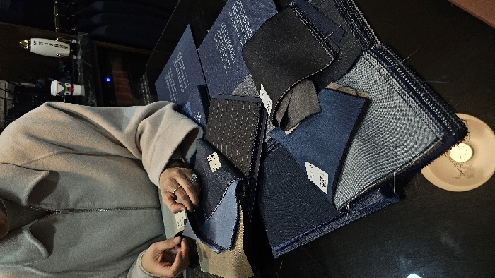 A person in a grey coat examines a stack of blue fabric swatches on a dark surface