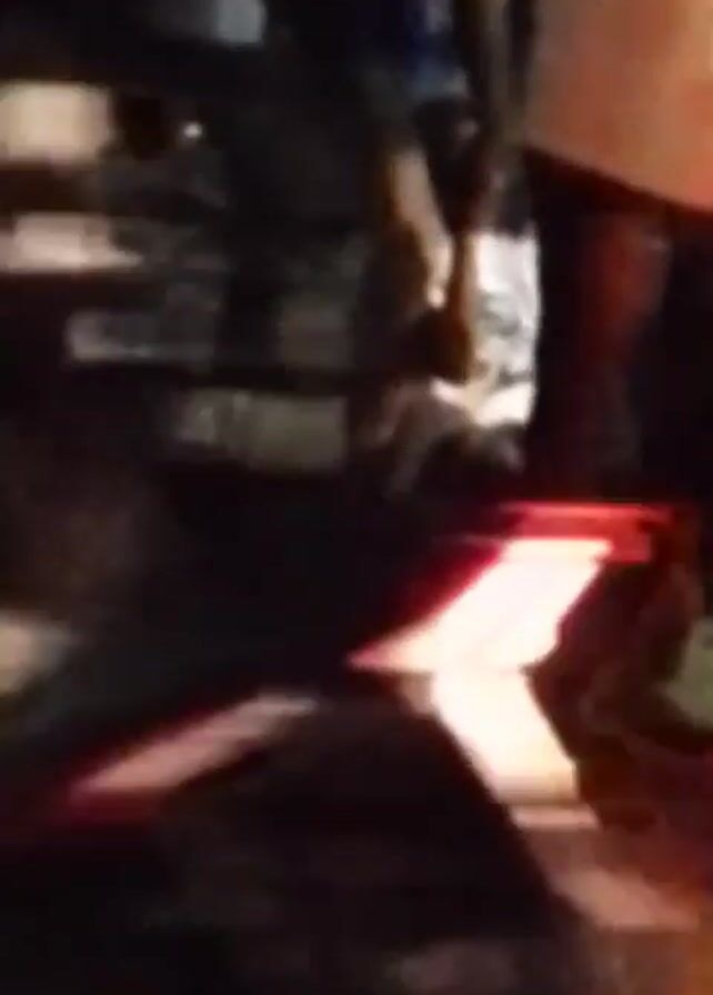scene that appears to be a traffic accident at night. A person is sitting on the ground, possibly injured. Other people are standing nearby, some possibly providing assistance or observing the situation. A motorcycle or bicycle can be seen on the ground. The video is dark and shaky, which makes it difficult to discern specific details.