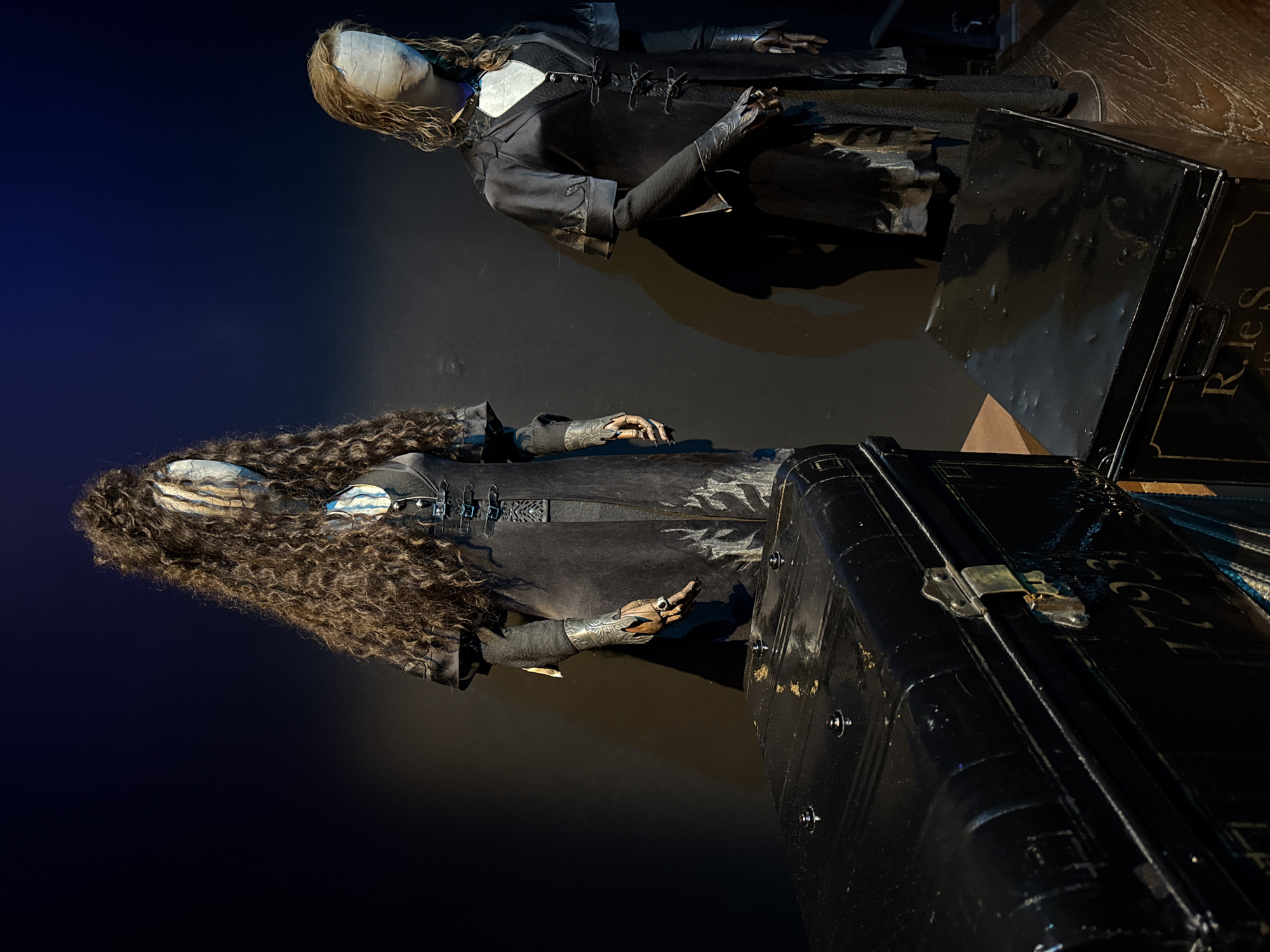 Two mannequins are displayed within an exhibition space. The setting features a dark background wall transitioning from deep blue to black, with a dark wooden floor. In the foreground are two glossy black trunks. The larger trunk on the left exhibits a metallic clasp and the number "1793" partially visible on its side, along with several dark, dome-shaped studs on its lid. The smaller trunk on the right shows text beginning "R. le S" on its side. The mannequin on the left stands taller, draped in a dark, long-sleeved coat with intricate detailing and an undershirt. Its head is covered with long, voluminous, dark brown curly hair, and its face is obscured by fabric. A prominent, patterned medallion with blue and white stripes is visible on its chest. The mannequin's visible left hand, made of a light wooden material, wears a silver-colored ring and an ornate bracelet. The mannequin on the right wears a dark, short-sleeved coat with button-and-loop closures down the front, over long dark undersleeves. Its head is covered with medium-length wavy light brown hair, and its face is similarly obscured by fabric. A dark choker or collar is visible around its neck. Its hands are also light wooden. The scene is illuminated by directed lighting, creating shadows and highlighting the subjects against the dark environment. This display is located within the Warner Bros. Studio Tour London – The Making of Harry Potter, in the Three Rivers District, United Kingdom.