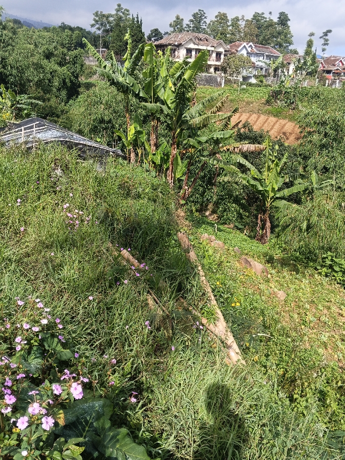 This image depicts a lush, verdant hillside environment within Wenshan City, China, under visible sunlight and a clear sky. The foreground is dominated by dense, tall green grass interspersed with patches of small pink flowers and larger green leaves. A distinct shadow of a person, showing the head and upper torso, is cast on the lower right-center. Diagonal across the mid-ground, several elongated wooden logs are laid down the slope. Further into the mid-ground, numerous large-leaved plants, likely banana trees, rise prominently amidst other dense green foliage. Beyond this, a tilled earth area, appearing as a reddish-brown patch, is visible on a gentler slope. On the far left, a structure with a dark, possibly corrugated roof and light-colored framework is partially visible, largely obscured by surrounding vegetation. The background reveals multiple multi-story residential houses situated on a higher, partially wooded slope. These houses feature varying architectural styles, including tiled roofs (some with dormer windows) and facades in shades of white, beige, and grey. Dense tree lines and additional greenery frame the top and sides of the scene. No individuals are explicitly visible within the scene itself, apart from the implied presence of the photographer via their shadow.