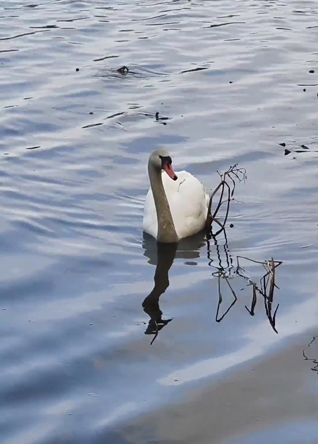 A single white swan swims on a body of water. The swan has a dark gray neck, an orange beak, and is surrounded by small floating twigs. The water is slightly rippled and reflects the swan. A few dark reeds are visible at the water's edge.
