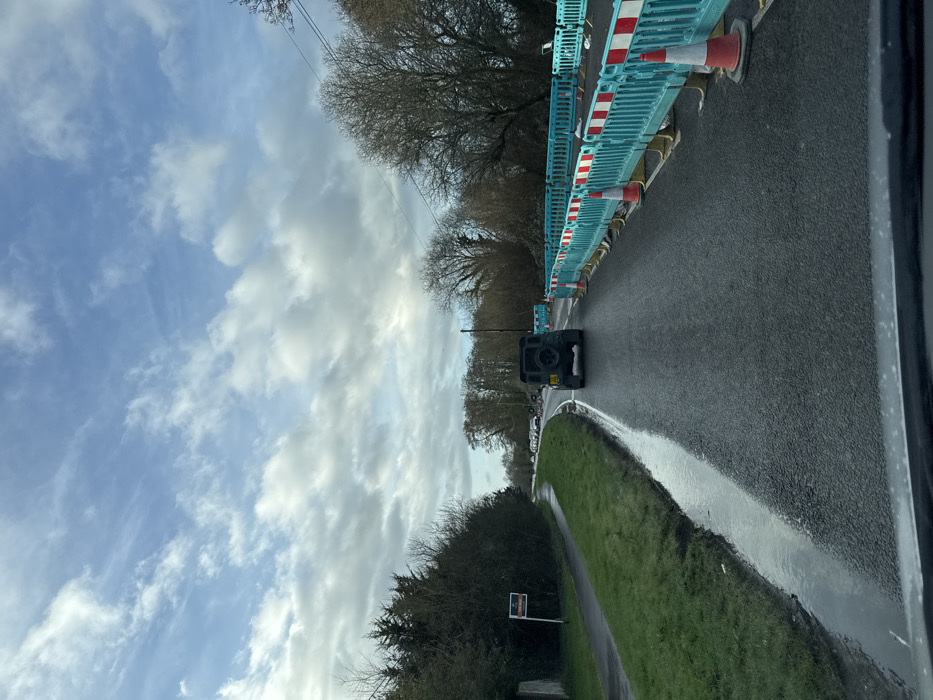 The image displays a rural road scene in New Forest, United Kingdom, observed from the interior of a vehicle looking forward on an overcast day. The asphalt road surface is wet and reflective, indicating recent precipitation, with a substantial puddle running along the left edge of the carriageway. A dark-colored Land Rover Defender, equipped with a rear-mounted spare wheel, is positioned centrally in the frame, traveling away from the viewer. To the right of the road, a construction or maintenance area is demarcated by a continuous line of interlocking turquoise plastic barriers with red and white reflective panels. Several orange and white traffic cones are positioned immediately in front of these barriers. The ground beyond the barriers appears disturbed. Bare deciduous trees and overhead utility wires are visible on the right side further in the background. On the left side of the road, a green grass verge borders a paved pedestrian pathway. A red "FOR SALE" sign with white text is affixed to a white pole on the grass verge. Dense evergreen and deciduous trees and shrubs line the property boundary behind the pathway. In the distant background, a line of light-colored vehicles is discernible along the road as it curves gently to the left. The sky is partially covered with white and grey clouds, revealing sporadic patches of blue. No individuals are visible in the scene.