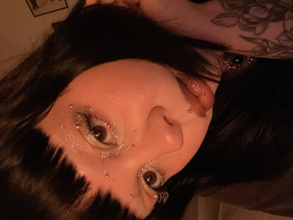 A tilted close-up shows a person's face adorned with glitter eye makeup and small facial gems. They have dark hair with bangs, and a visible tattoo on their arm features floral designs. A piercing is visible on their tongue and nose. They also wear a necklace with a large stone. The lighting appears dim, creating a warm tone across the image.