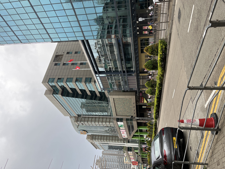 This image depicts a bustling urban street scene in Sham Shui Po, Kowloon, Hong Kong, China, under an overcast sky. The prominent structure dominating the mid-ground is the multi-story Dragon Centre shopping mall, characterized by its complex facade integrating glass, pre-cast concrete panels, and distinctive green architectural elements. A large, golden, circular emblem (likely a dragon) is visible on a curved glass section of the mall's upper floors. Below, at street level, various retail storefronts are visible, some with external escalators. To the immediate right of Dragon Centre stands a modern high-rise building with a reflective, blue-tinted glass curtain wall, mirroring reflections of surrounding architecture. Two red flags bearing the white five-petal bauhinia flower emblem of Hong Kong are flown from poles positioned between Dragon Centre and the blue-glass building. Further to the left background, additional residential or commercial high-rise buildings are visible. In the foreground, a multi-lane asphalt road runs horizontally across the frame. White lane markings are present on the pavement, and yellow double lines run along the curb on the left side. A dark grey sedan, identified as a Mercedes-Benz with a yellow license plate displaying "U7 AN", is parked or stopped on the left side of the road, facing away from the viewer. Along the sidewalk edge, gray metal pedestrian barriers are installed. A red and white striped traffic cone with black base and Chinese characters is situated on the pavement near the curb on the left foreground, adjacent to the metal barrier. A series of manicured green bushes are planted in a long planter box, separating the street from the pedestrian areas. Numerous pedestrians are visible on the sidewalks in front of the buildings, primarily walking in various directions. Most are casually dressed, and some appear to be wearing face masks. No specific interactions between individuals are discernible. The overall lighting is diffused, indicating an overcast day without direct sunlight.