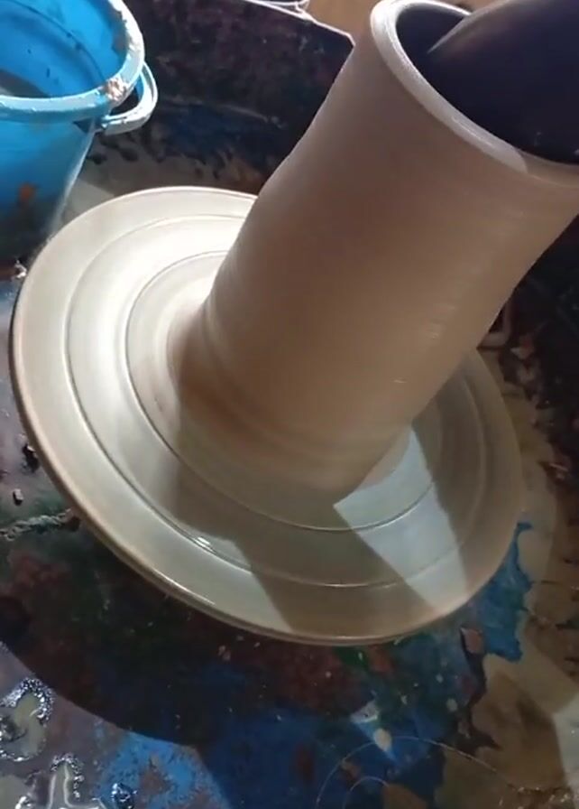 A person is shaping a clay pot on a spinning pottery wheel. The pot is elongated and cylindrical in shape. Water is splashed around the base of the wheel. The person's hand is visible inside the pot as it spins. Blue and gray buckets are in the background. The table underneath the wheel has splotches of paint on it.