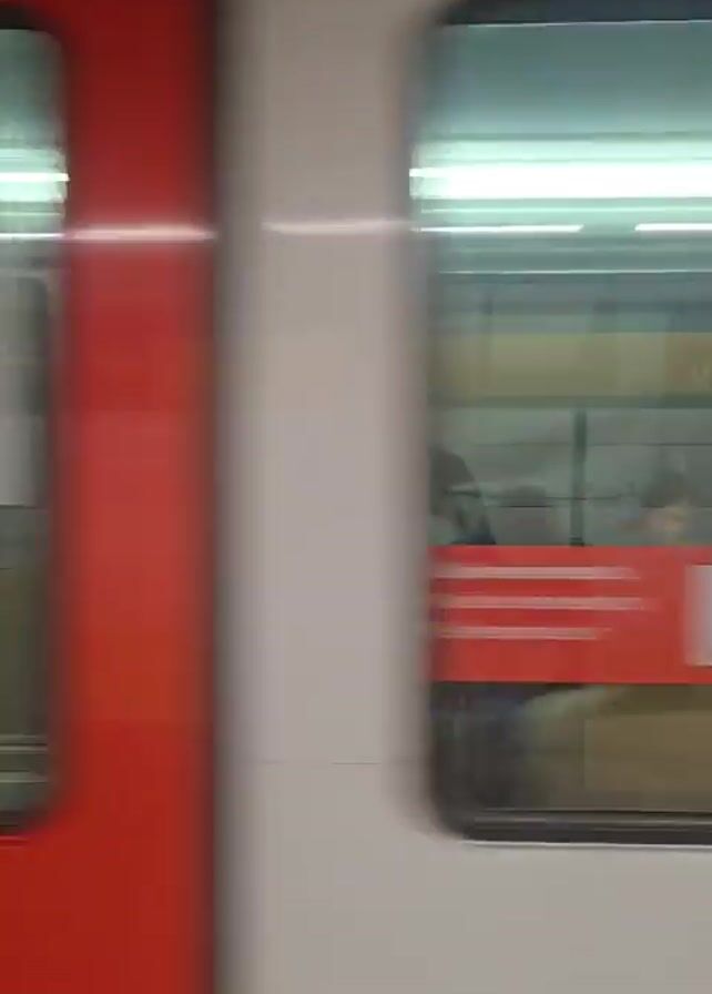 A brief video shows the exterior of a moving train passing by. Through the window, there are people inside the train, some standing, others sitting. The train’s color scheme is red and white.