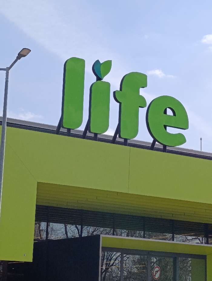 The image displays the upper section of a commercial building located in Cherven Bryag, Bulgaria. A large, three-dimensional sign spelling "Life" in bright lime green with black borders is prominently mounted on the building's facade. The dot of the 'i' is a stylized bi-colored green leaf. The building's upper facade is clad in matching lime-green panels, while a section below features reflective glass windows. These windows capture reflections of bare tree branches and a partially cloudy blue sky. To the left of the "Life" sign, a grey metallic street light pole with a luminaire extends into the sky. Within the reflection of the lower glass entrance, a circular "No Right Turn" traffic sign is visible. No individuals or direct interactions are present in the frame.