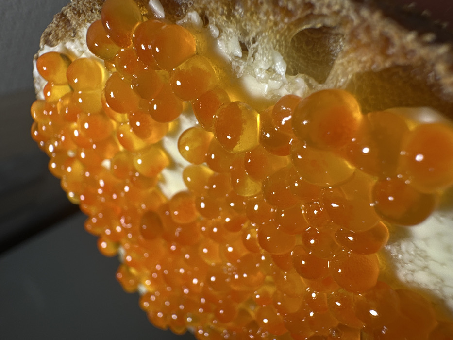 - "A close-up, high-angle forensic view depicts a prepared food item, a single piece of what appears to be toasted bread or a similar baked good, spread with a pale, creamy substance, and generously covered with multiple layers of red caviar (salmon roe)" by FM-cOgJG3, licensed under CC BY 4.0