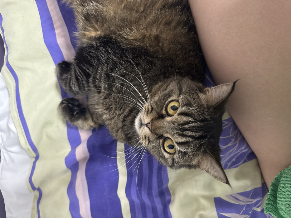 - "A tabby cat lies on its back on a striped purple and light yellow bed sheet" by FM-PZrEh2, licensed under CC BY 4.0
