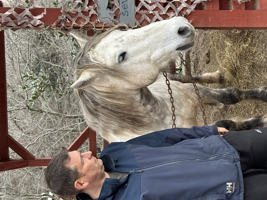 An outdoor scene in Podostrog, Montenegro, depicts a man standing next to a horse under a rustic wooden shelter. The man, a middle-aged male with short, dark hair, is positioned on the left, looking rightward towards the horse. He wears a dark blue and black Helly Hansen Workwear zip-up jacket over a dark olive-green shirt, and black 4F brand sweatpants. The horse, a light gray dappled equine with a darker gray mane and lower legs, stands to the right of the man, facing away from the viewer with its eyes partially closed. A rusty metal chain is looped loosely around its lower neck/chest area. The ground beneath the horse consists of dirt mixed with straw and hay. To the far right, a red wooden post features a partially visible white sign with black text "sev" and a dark animal silhouette above it, partially obscured by faded, light-colored camouflage netting. The background reveals a natural landscape of mostly bare deciduous trees and some sparse green foliage.