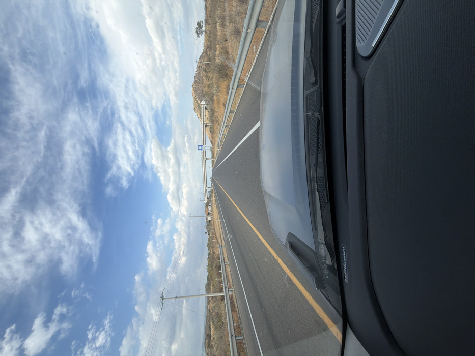 Captured from within a vehicle, the image reveals a straight, seemingly endless highway stretching into the distance. The road is marked with yellow and white lines, bounded by a metal guardrail. Beyond the guardrail, arid landscape transitions into a vibrant blue sky dotted with fluffy white clouds. The car's dashboard and a portion of the windshield are visible, anchoring the viewer to the immediate perspective. The angle imparts a sense of speed and forward motion.