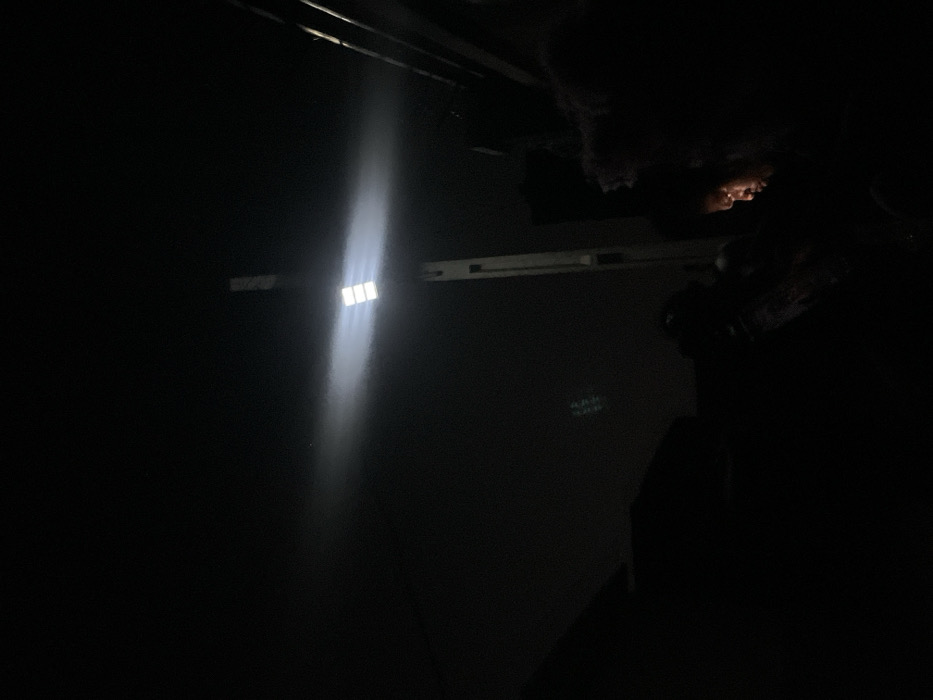 A low-angle, dimly lit image shows a figure mostly obscured in shadows on the right, with a small section of their face illuminated. A bright, vertical beam of light shines from a source above on the left, casting a stark contrast against the darkness. The background reveals a ceiling with visible pipes or beams and possibly insulation. There are faint, blurred markings or text visible on the wall between the light and the figure.