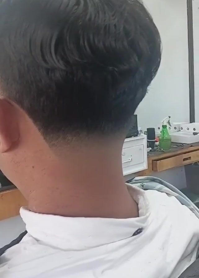 The back of a person’s head with a fresh haircut is presented from behind in a barbershop setting
