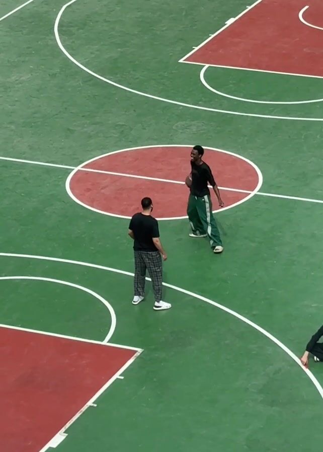 Two men are standing on a green and red outdoor basketball court. A third man sits cross-legged off to the side. The man on the left wears a black t-shirt and grey plaid pants. The man on the right wears a black t-shirt and green pants with white stripes. He is holding a basketball and pointing. The man on the left appears to be listening. The basketball court has white lines defining its boundaries.