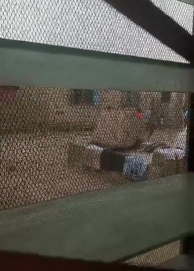 view from indoors, looking out through a window with a wire mesh screen. The view outside is of a yard or open area, with what appears to be clothing drying on a line, scattered objects, and people moving around in the background. The lighting is somewhat dim and there are shadows cast by the window frame. The focus is not very sharp and the details are obscured by the mesh screen. In the background, a person in a red shirt is visible.