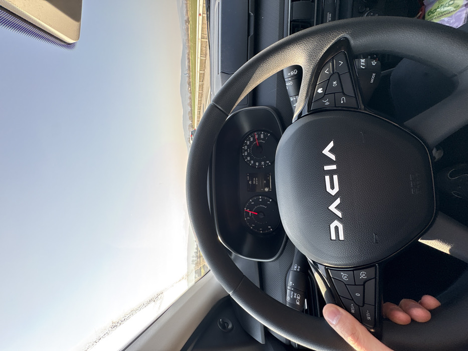 The image presents a first-person view from the driver's seat of a Dacia vehicle, in motion near Dolna Dikanya, Bulgaria